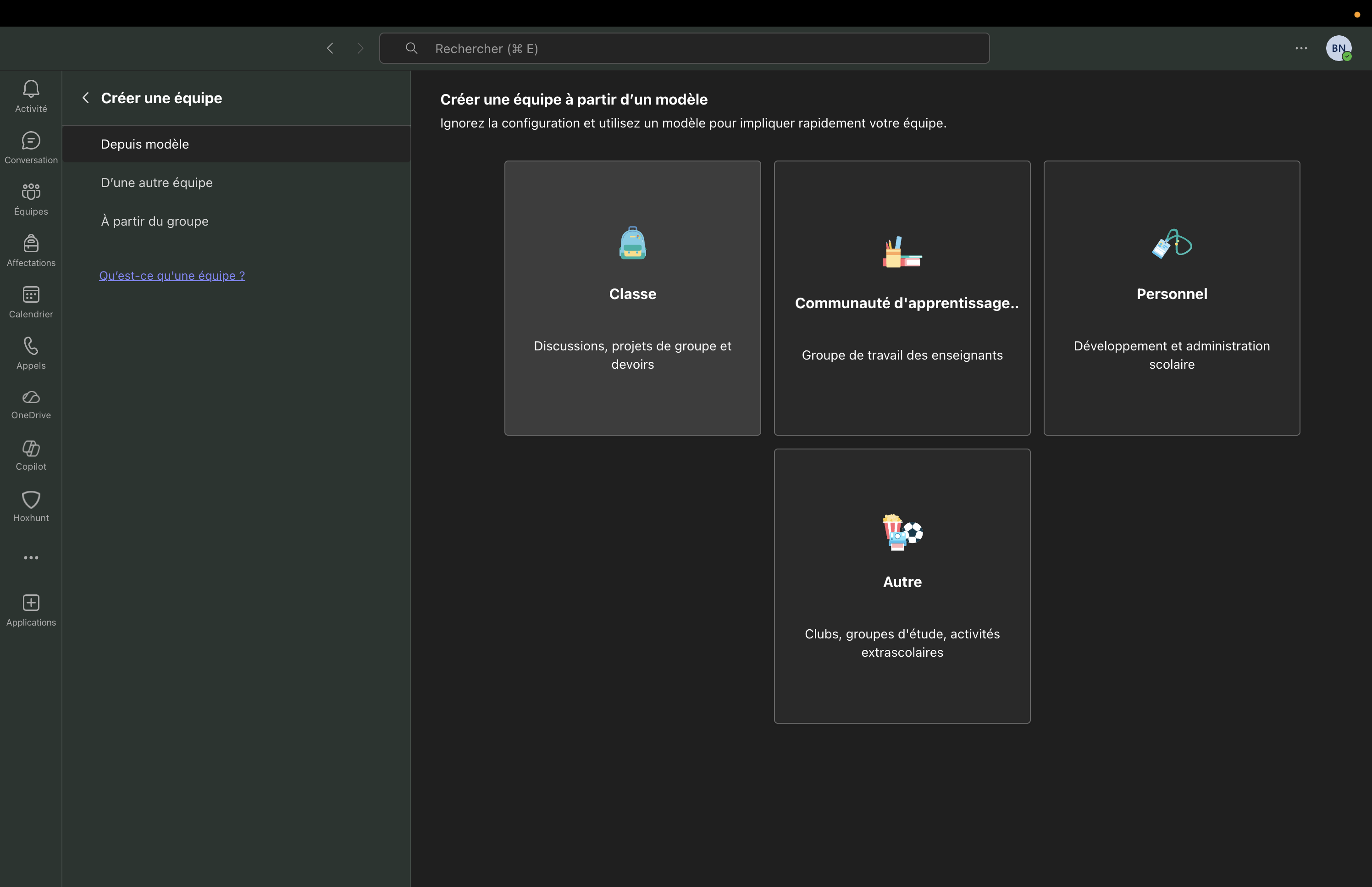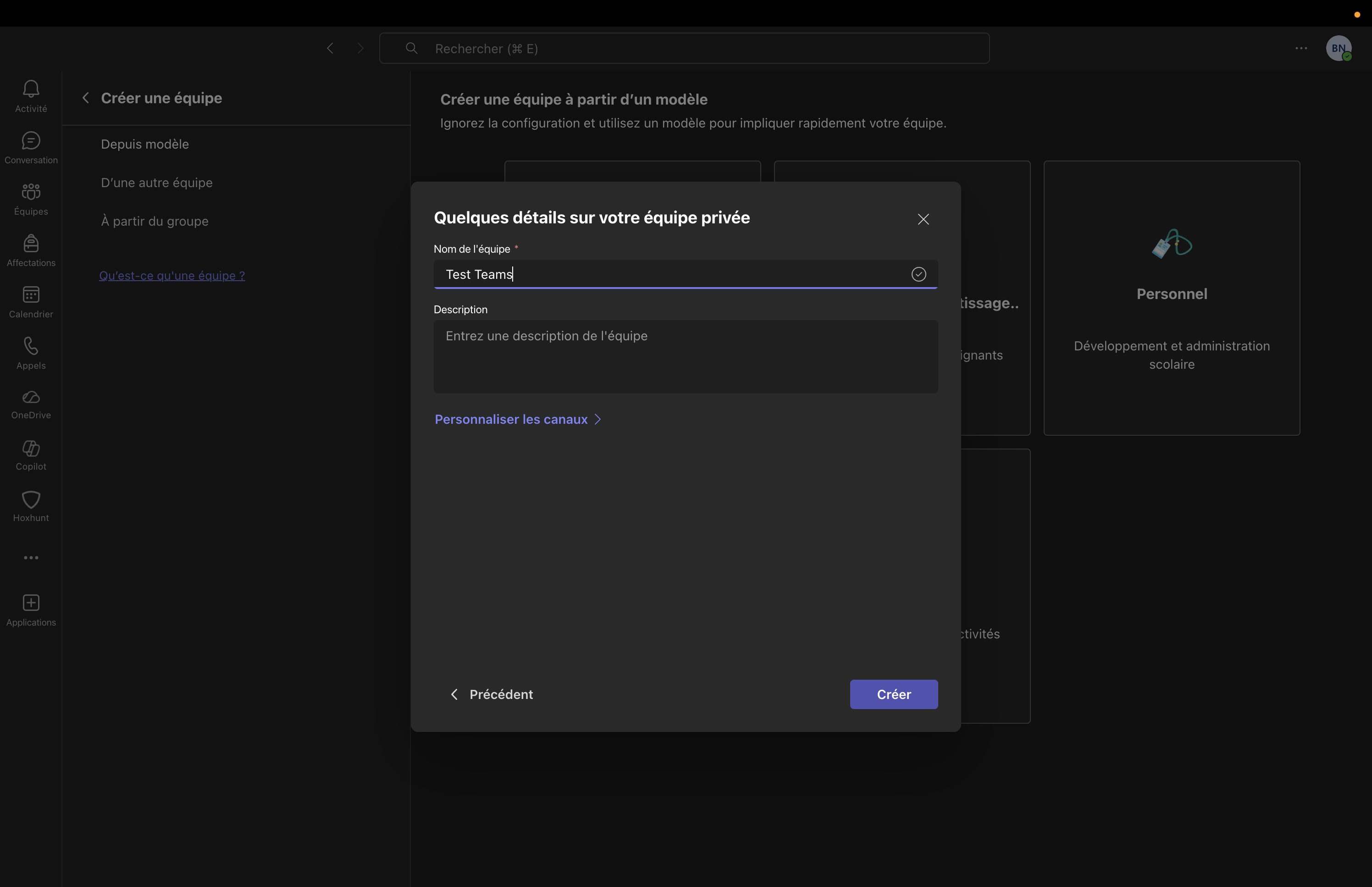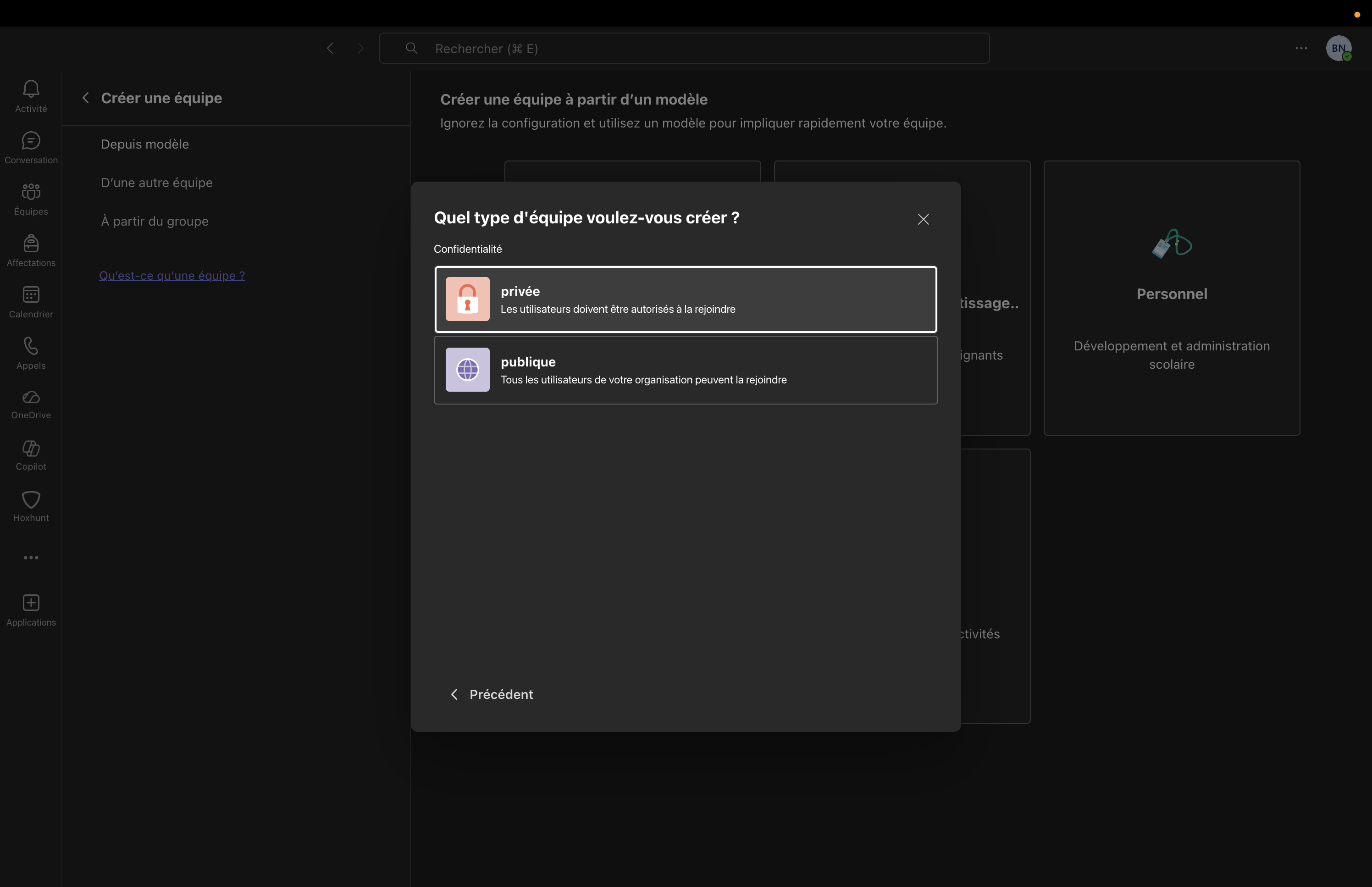 L'organisateur doit ensuite choisir le type d'équipe qu'il souhaite créer.