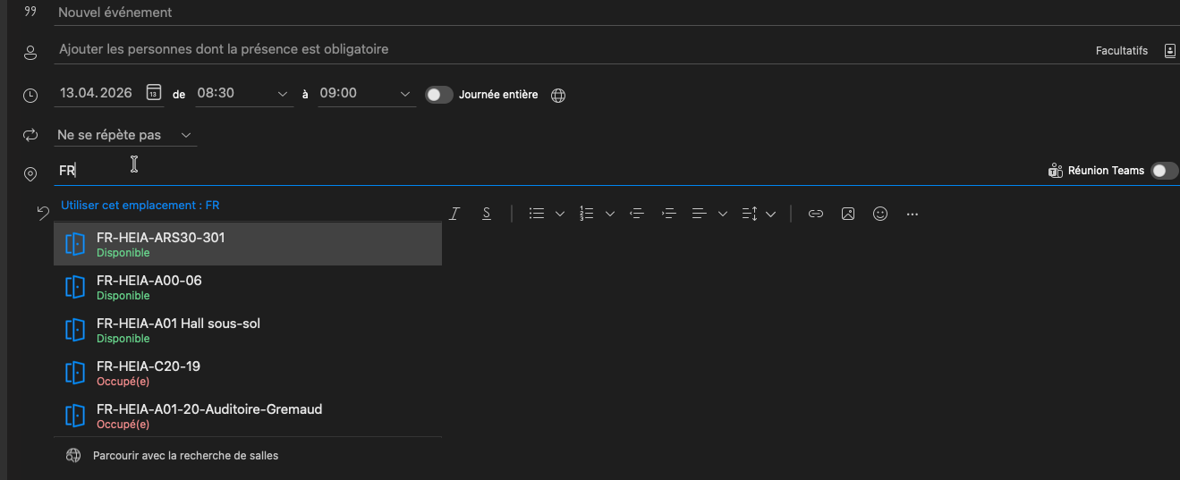 Ensuite, il faudra remplir les champs demandée et sous emplacement, il faut mettre le nom de la salle que vous voulez réserver (par exemple : FR-HEIA-... ou FR-HEG-....). Vous verrez en dessous du nom de la salle si elle est disponible.