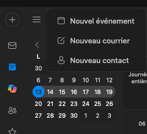 Pour réserver une salle à partir de votre calendrier Outlook : ouvrez Outlook, ❶ allez dans votre calendrier puis ❷ cliquez sur "Nouvel événement".