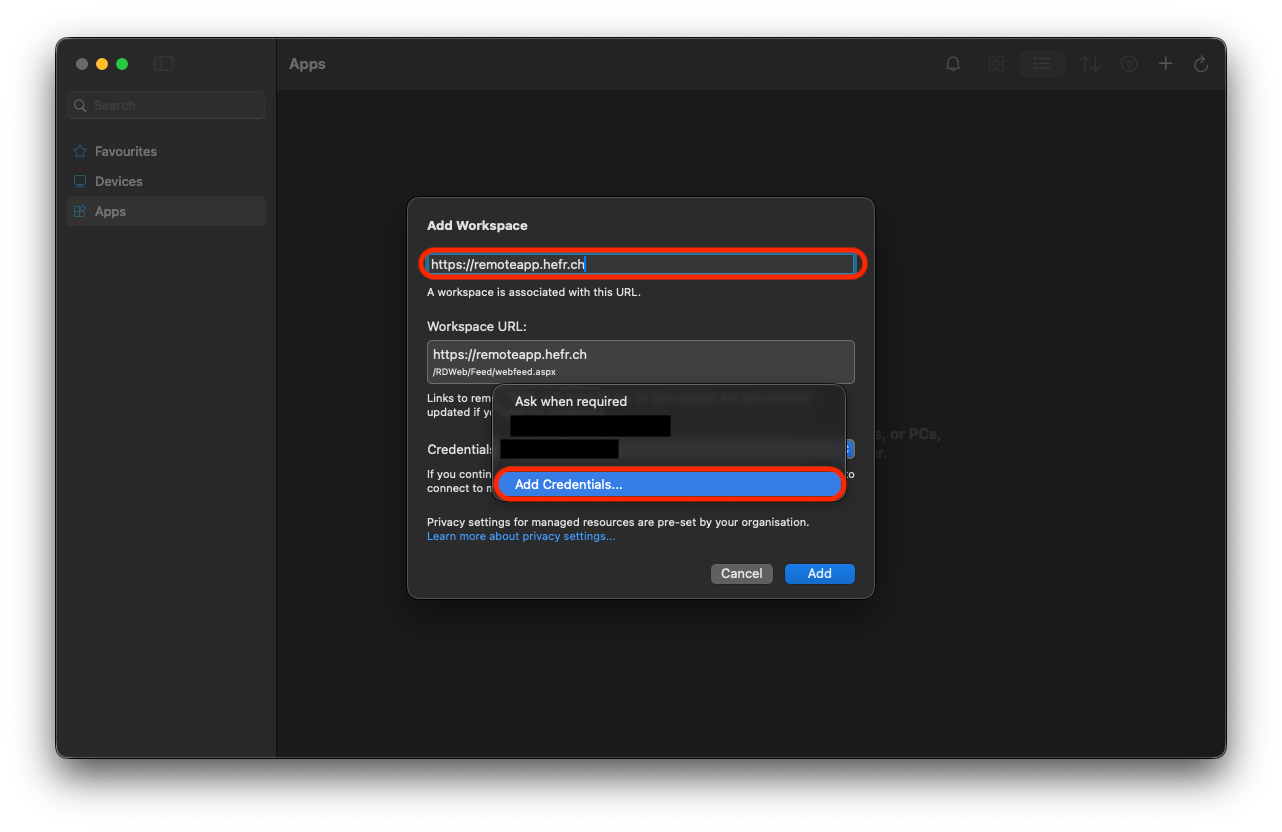 - Cliquer sur l’option “Ask when required” puis “Add Credentials”