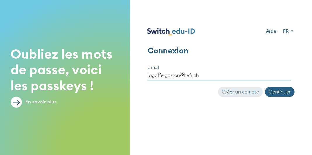 Connectez-vous avec votre compte HES-SO (8.8@hes-so.ch) pour accéder aux ressources internes de la HES-SO Fribourg