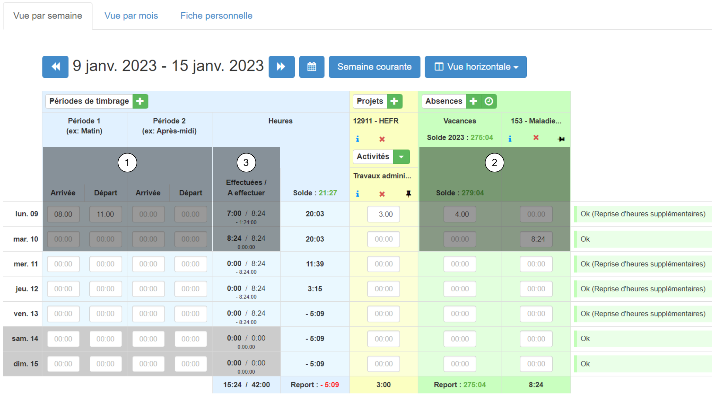 - mar 04 : Heures travaillées (0:00) + Heures d'absence (8:24) = Heures effectuées (8:24)